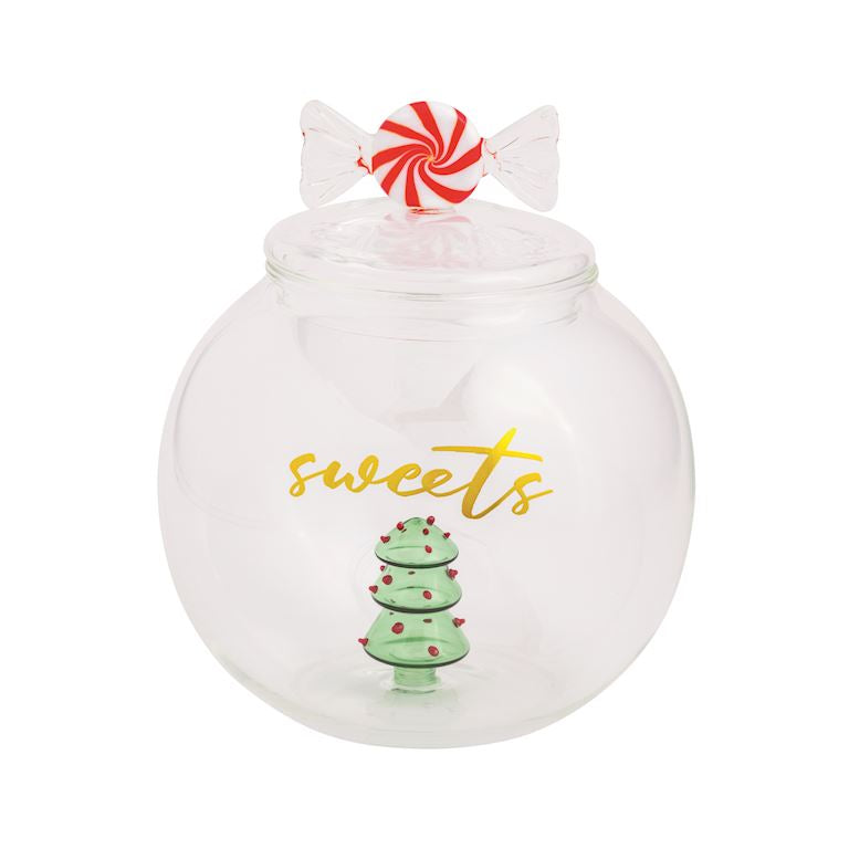 Glass cookie jar features dimensional interior glass tree and gasketed lid with peppermint handle.