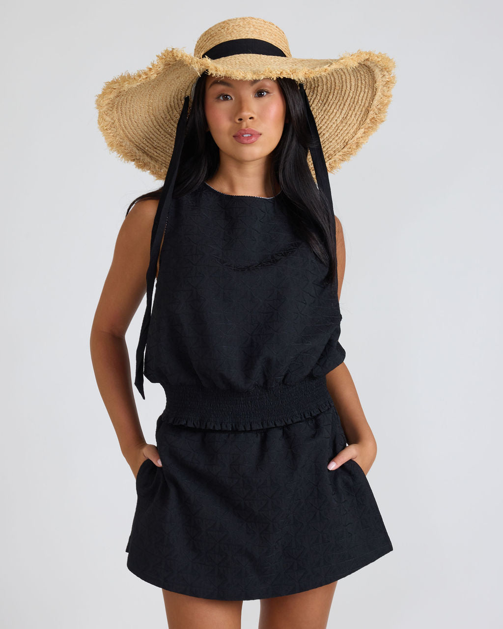 The wide smocked waistband creates a flattering, slightly cropped silhouette that cinches perfectly, while the relaxed fit through the chest keeps it breezy for those warmer days. Whether you're heading to the beach or out for a casual dinner, this top brings a polished, chic energy to any look.