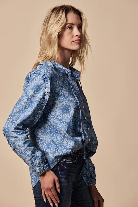 With subtle ruffles running down the shoulders and sleeves and a tie at the neck, we are loving how versatile this shirt is.