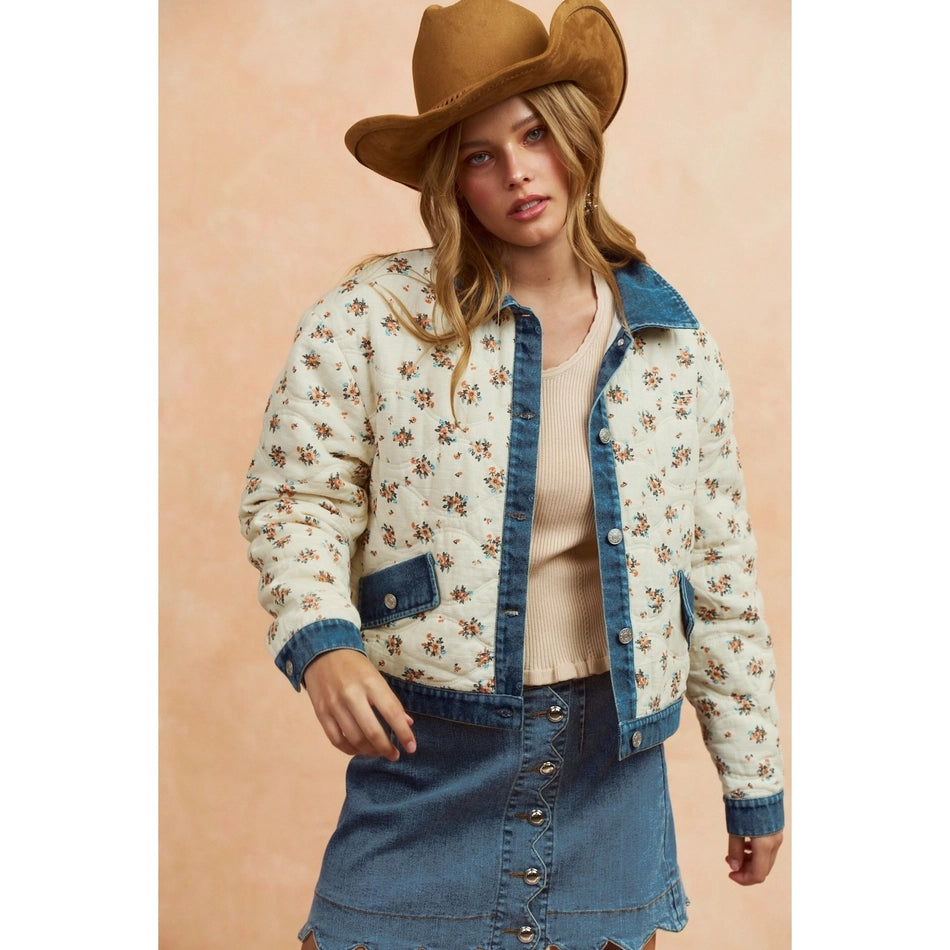 Washed Denim Collared Quilted Floral Jacket