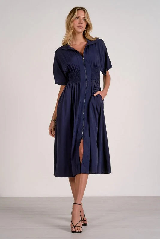 An effortless silhouette with elevated edge. The Elle dress features a flowing midi skirt and a smocked waistband that defines the shape while offering all-day comfort. The short-sleeve design and relaxed fit create a breezy, flattering look perfect for sunny days or transitional layering.