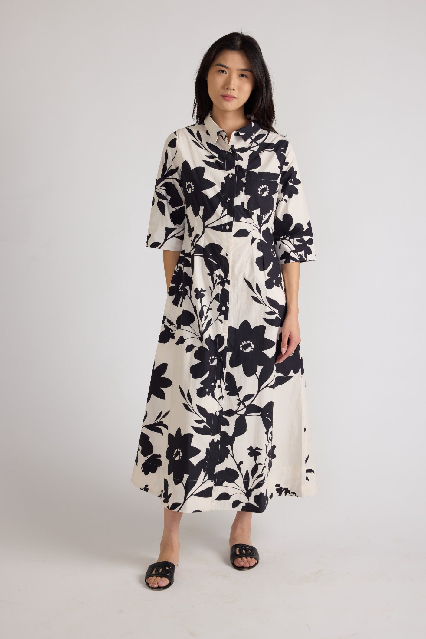 Make a statement in monochrome. The Justine Dress features a striking, large-scale botanical print that feels both modern and romantic. With its crisp collar and button-down front, this dress offers a polished look, while the relaxed A-line skirt adds a sense of effortless movement.