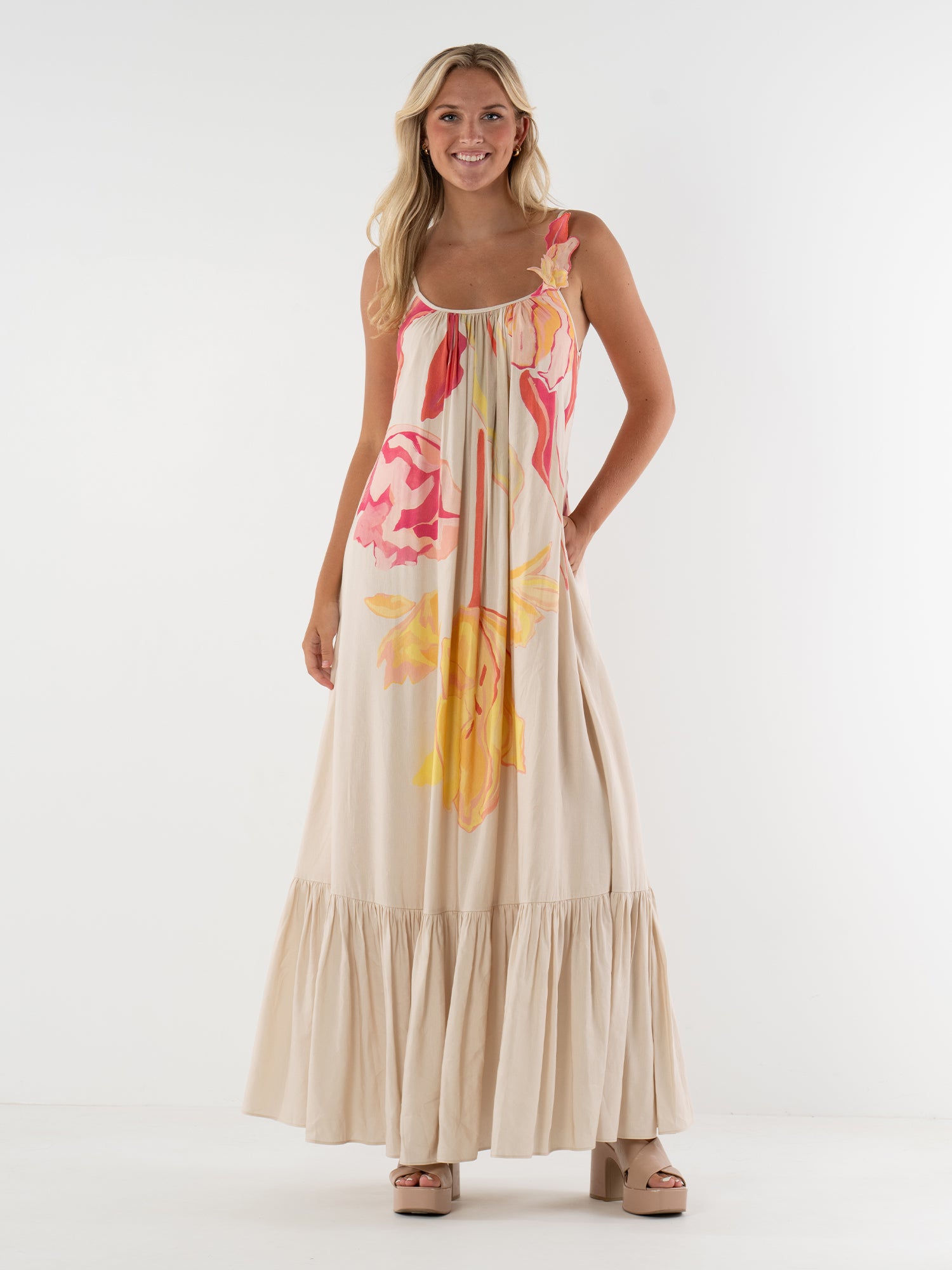 The Susannah Maxi features slender shoulder straps accented with a floral appliqué, paired with a low scoop back that adds a graceful, flattering touch. Designed with a loose-fitting silhouette, the dress falls into a tiered maxi-length hem that moves beautifully with each step. Created in collaboration with artist Jessica O’Neill, the Botanical Muse print translates hand-painted florals from canvas to clothing in an inverted layout rendered in soft pastel hues.