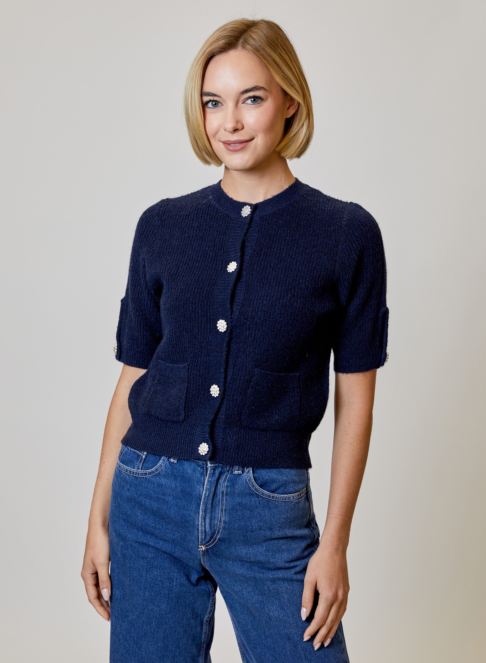 Polished yet cozy, our Gemstone Button Cardigan in Navy Academy brings an elevated twist to a timeless silhouette. Designed with a soft textured knit and flattering short sleeves, this piece features sparkling gemstone buttons and front patch pockets for a touch of effortless sophistication. The deep navy hue makes it a year-round staple that pairs perfectly with denim, trousers, or layered over a dress for a chic, pulled-together look.