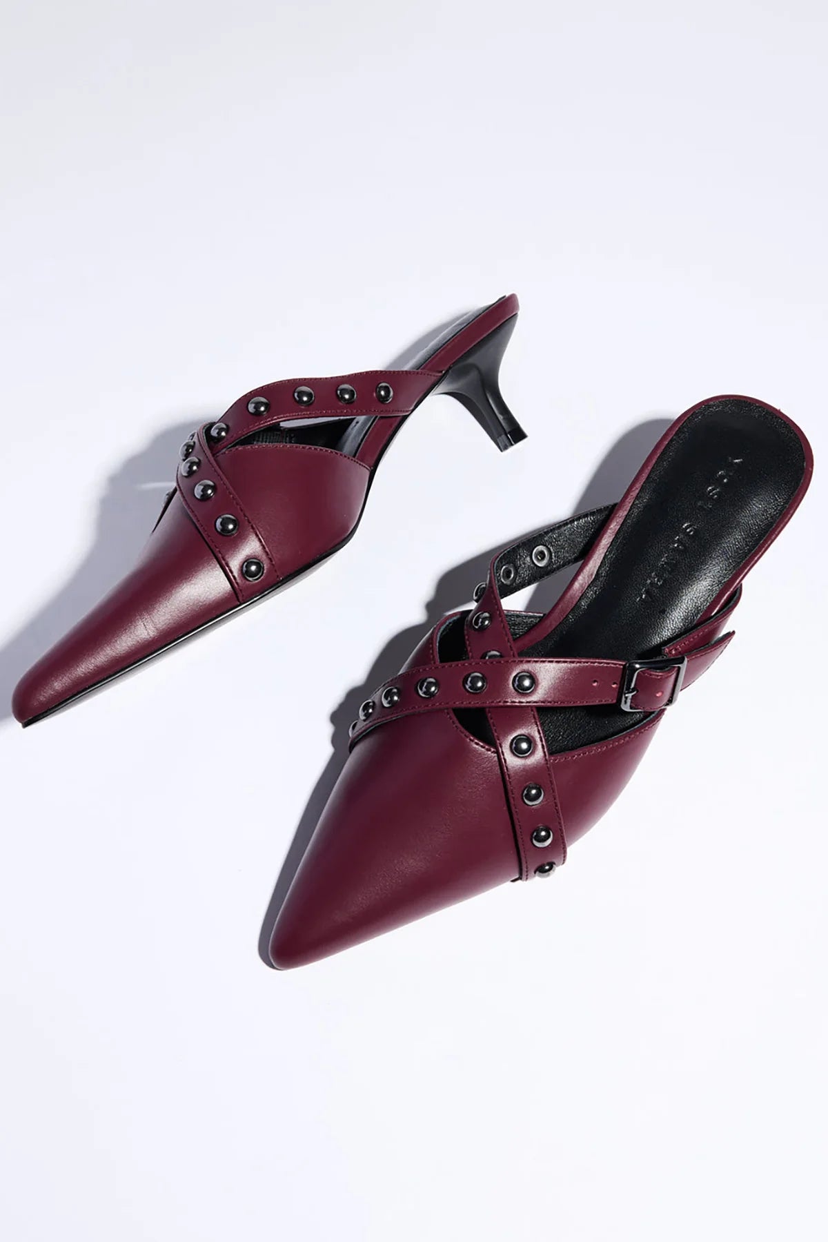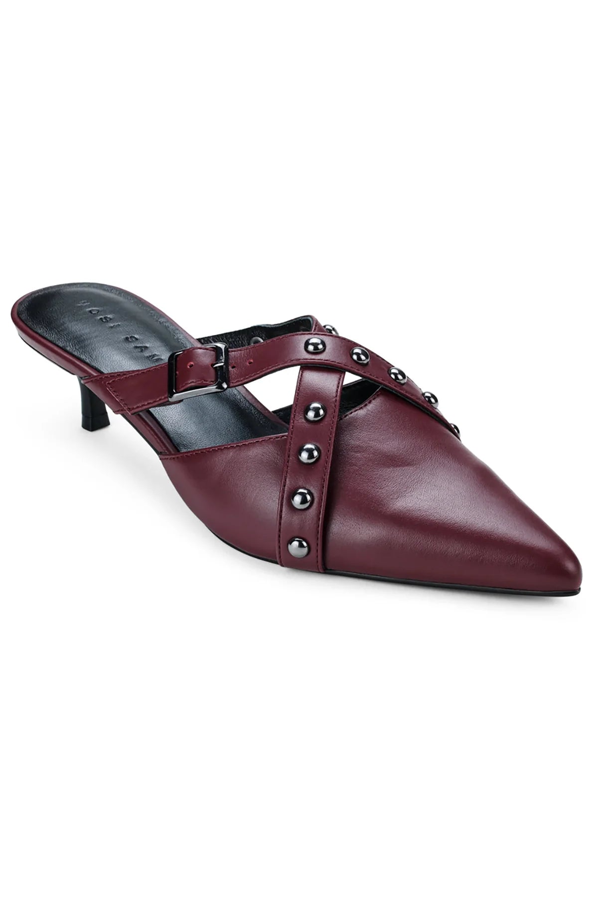 Alexis is a chic pointed-toe mule with sleek straps and stud details. Its low kitten heel offers comfortable lift, making it perfect for day-to-night wear.