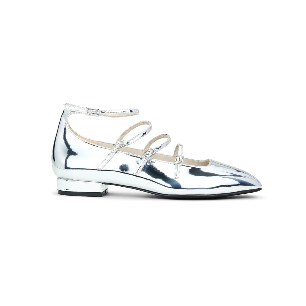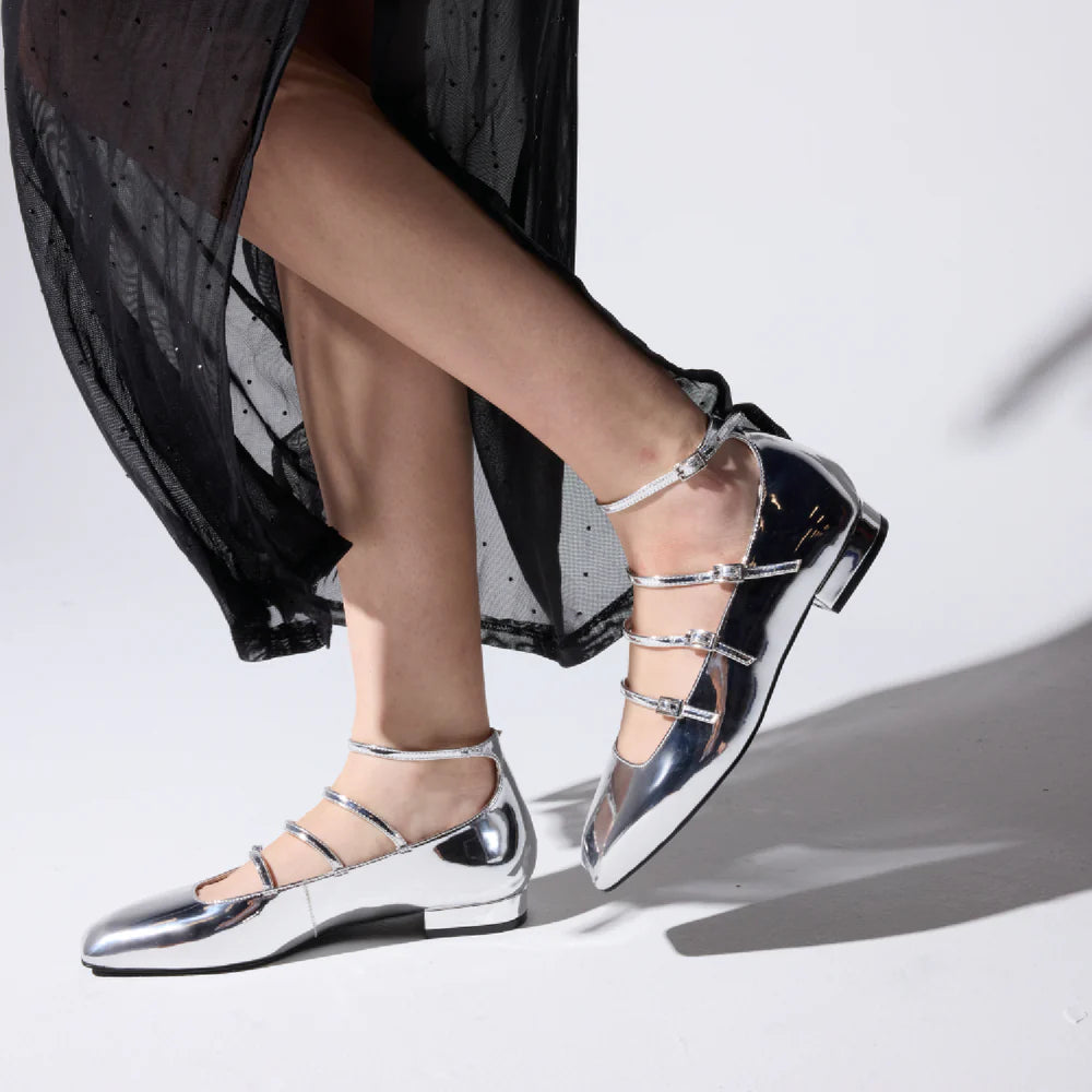 Shine brighter in the Aurora Silver Mirrored Metallic Flat—a bold twist on our modern classic. The sleek mirrored finish and elegant multi-strap silhouette catch the light with every step, while a delicate ankle strap adds polished sophistication. Perfect for nights out, celebrations, or whenever you want to stand out.