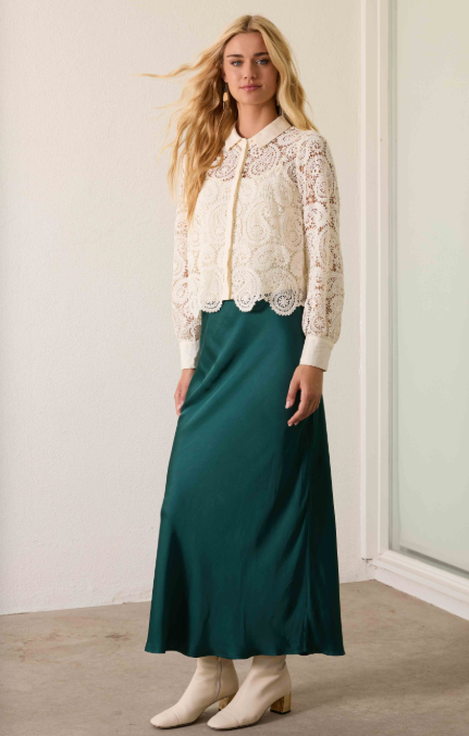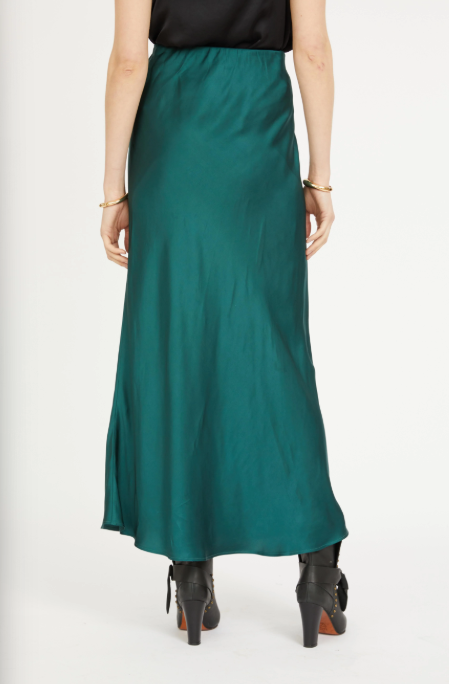 Our Bria Skirt is crafted from a smooth viscose-rayon blend that offers a soft, fluid drape. Designed in our rich Sea Moss color, this midi-length skirt brings a refined pop of color to any outfit.