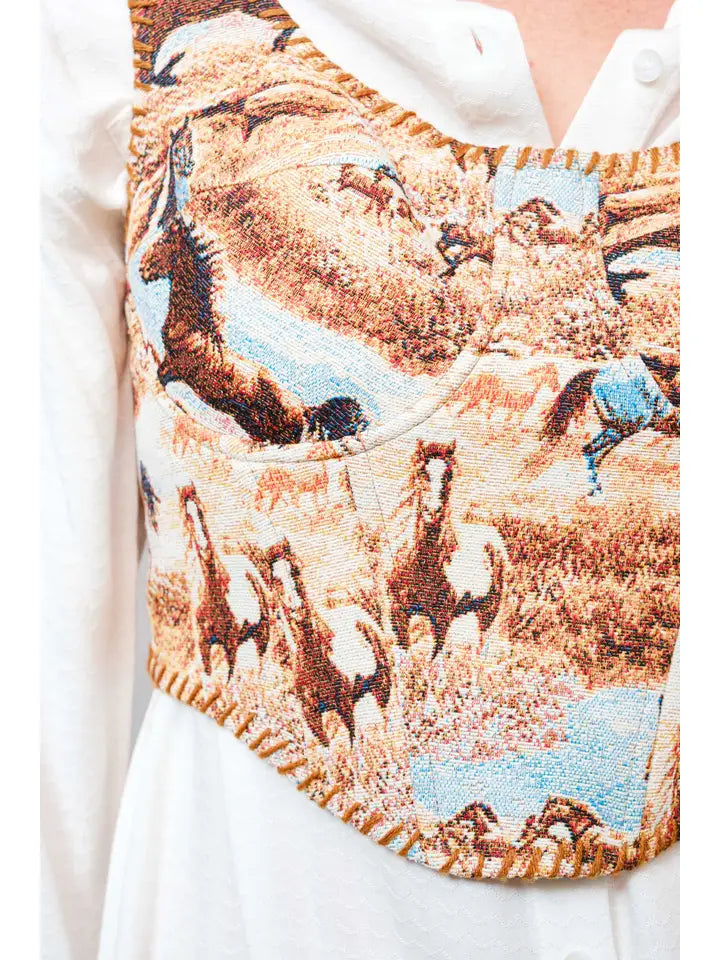 Western-inspired jacquard corset top featuring a horse print, structured fit, and stitched edges. Designed with a hook-back closure and cropped silhouette, perfect for layering over dresses or tops.