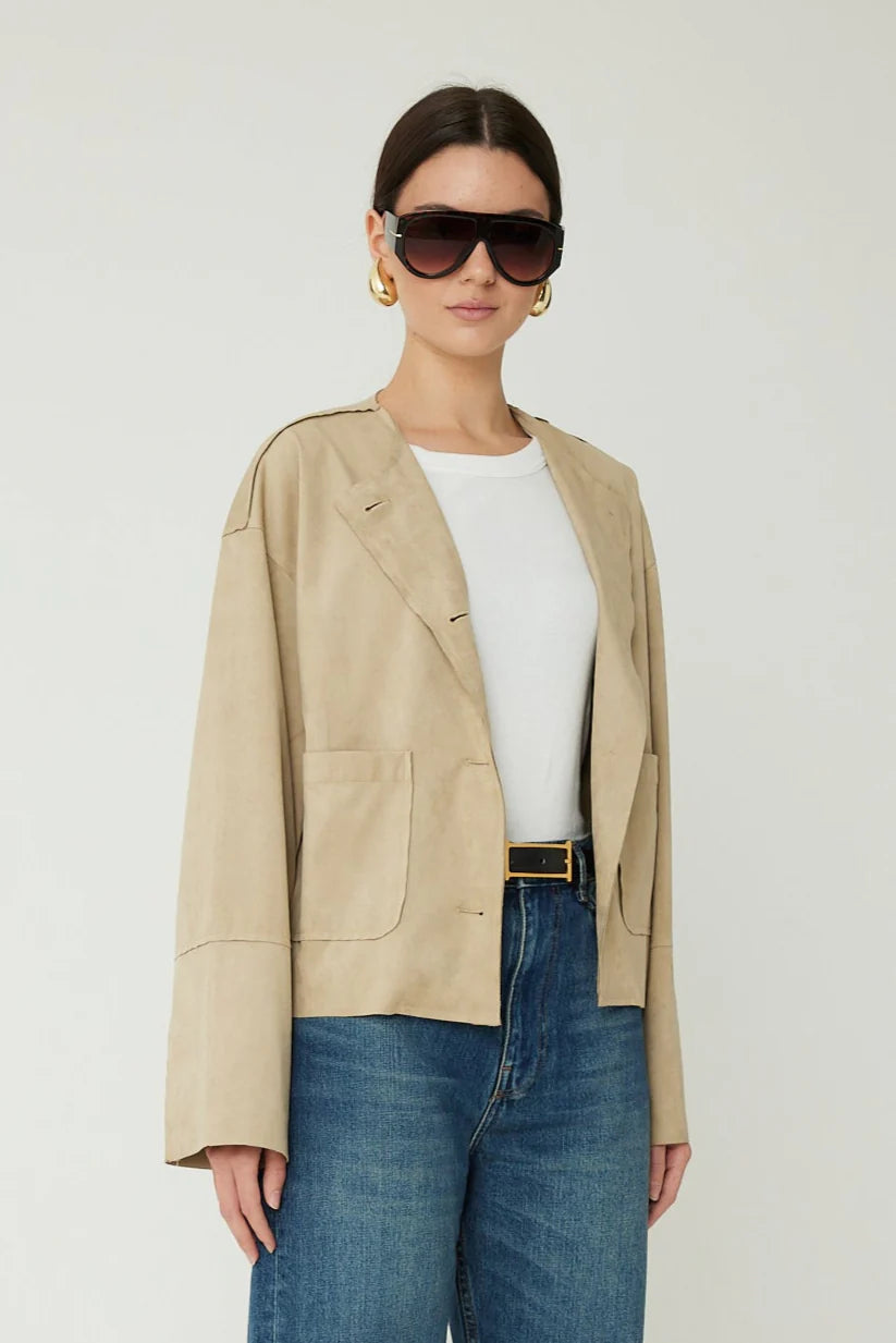 The Alta Jacket features an ultra-suede fabric in an elegant tan shade. Its lightweight, unlined design is ideal for early autumn wear. With suede gaining popularity this season, this jacket blends trendiness with comfort. The relaxed fit and raw cut accents deliver both effortless style and a contemporary edge.