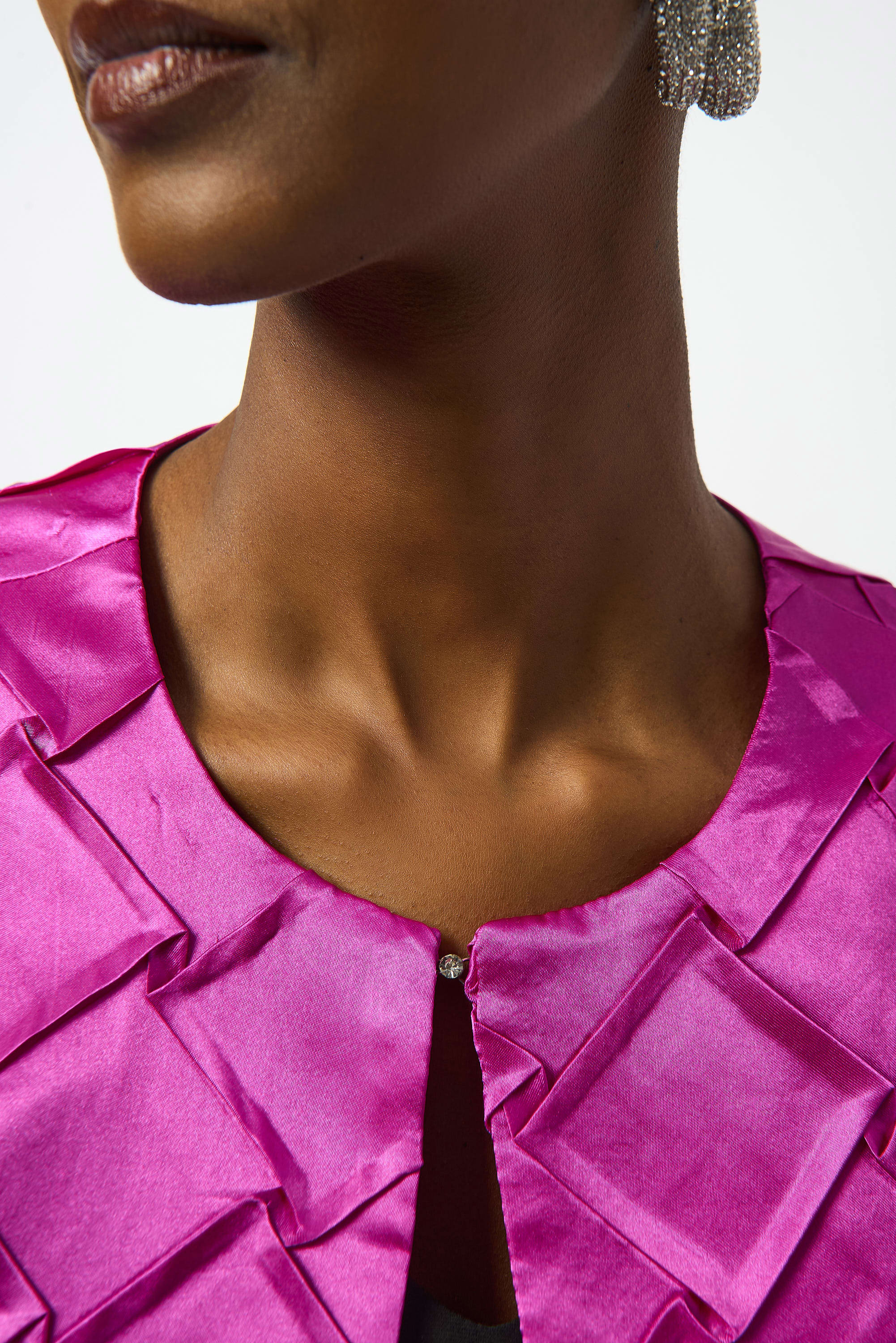 Add a touch of colour and texture to your evening wear with our collarless jacket, crafted from luxurious textured satin. Featuring a sleek straight silhouette, cropped length, and three-quarter sleeves, this versatile piece pairs beautifully with dresses, skirts or dress pants. The embellished hook-and-eye closure at the neckline adds a refined, elegant finish, making it a standout addition to your wardrobe.