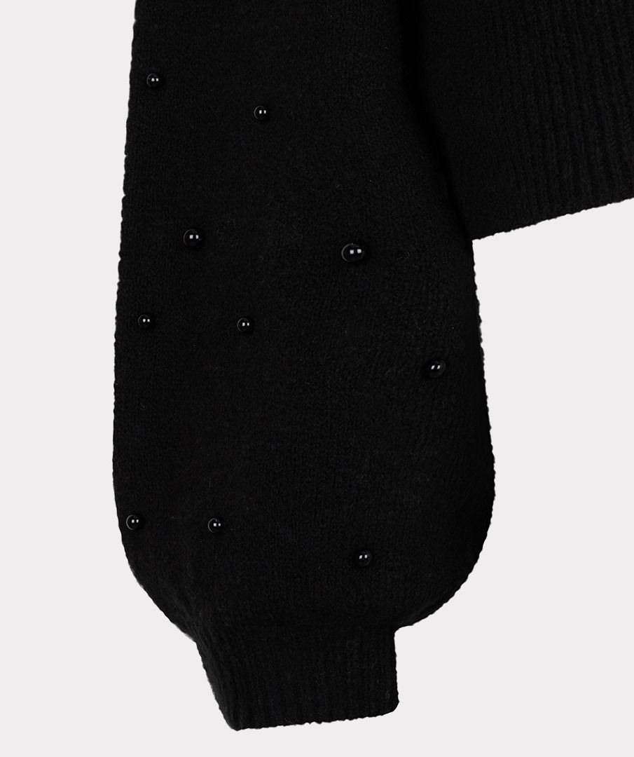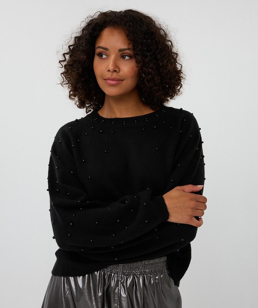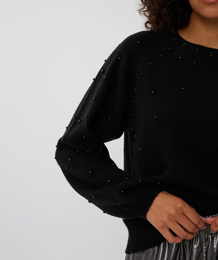 Comfy sweater with small beads across the shoulders and arms for a playful touch. The sweater is made of 53% cotton, 25% acrylic, 20% polyester and 2% spandex. Model is 1.73m and wears size S.