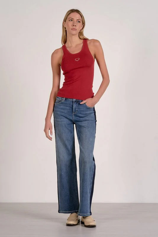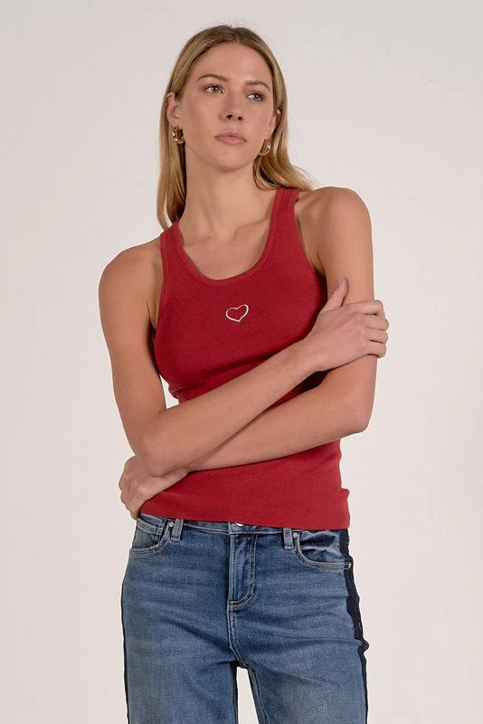 Make a playful statement in the Tina tank — a fitted ribbed knit with contrast stitching and dainty embroidery. Designed with a high neckline and cropped hem, this tank is the perfect base for denim or cargo pants and layers easily under a jacket for transitional wear.