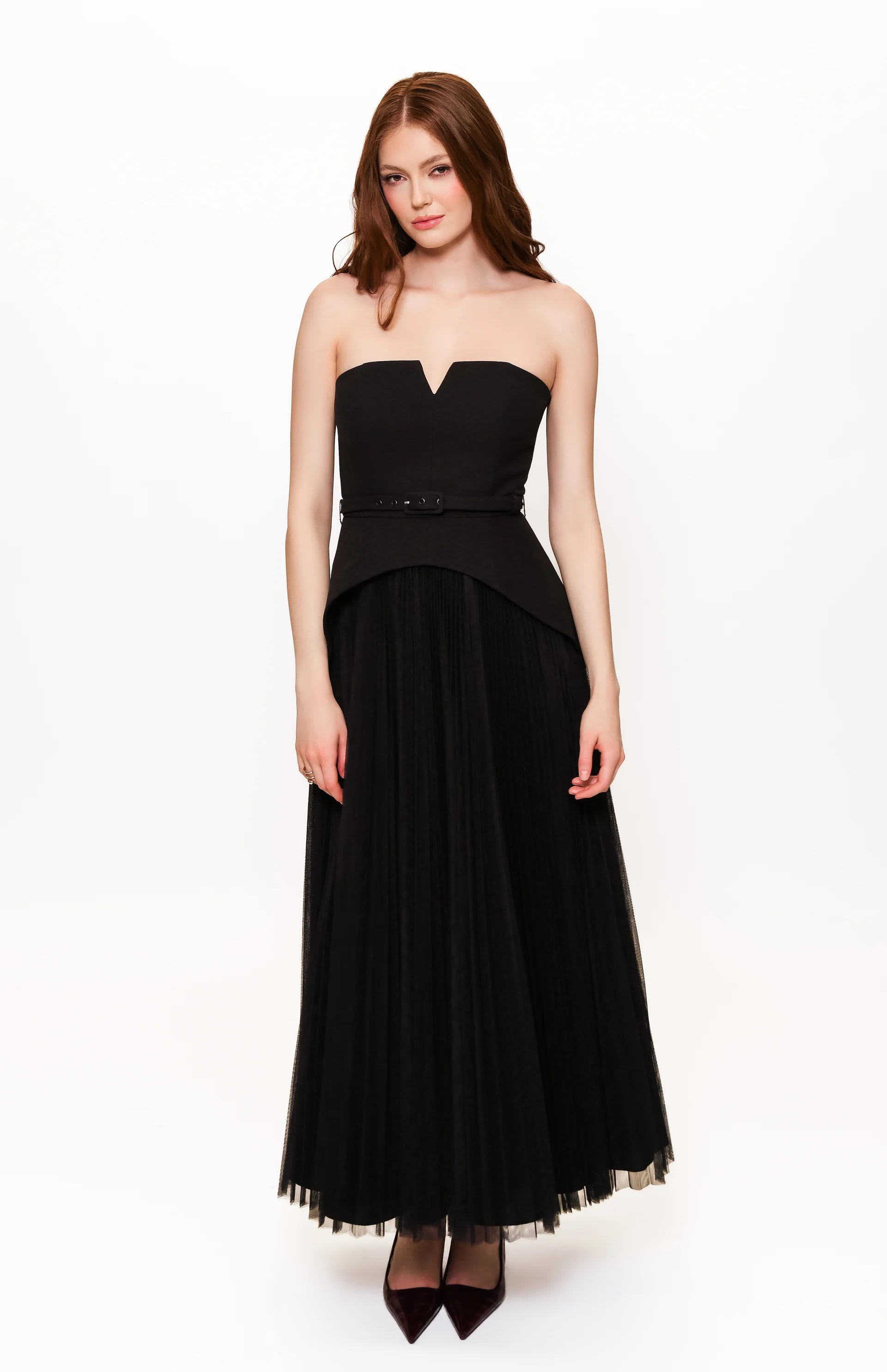Strapless mixed fabric maxi gown